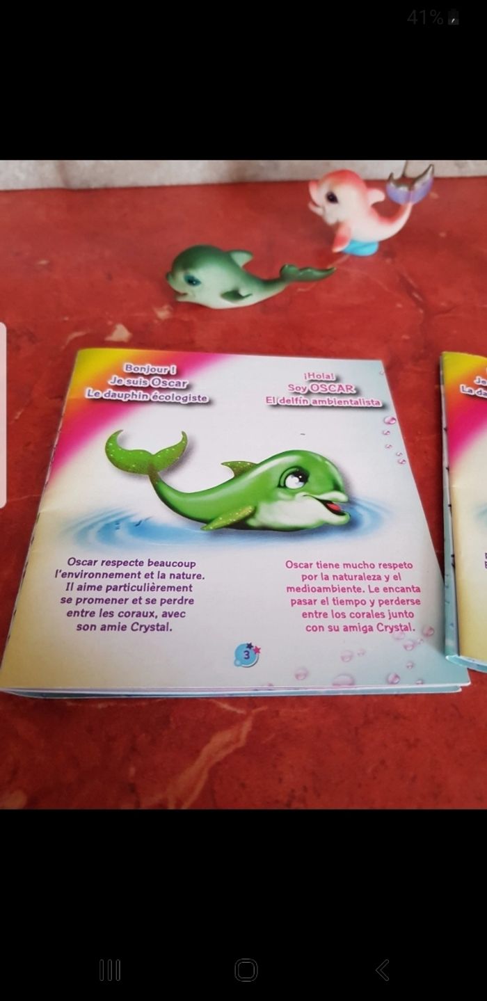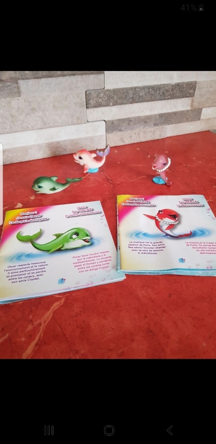 Lot de 3 dauphins faisant partie de la collection les dauphins de l arc en ciel Magiki. 2 sur 3 ont leur livret.