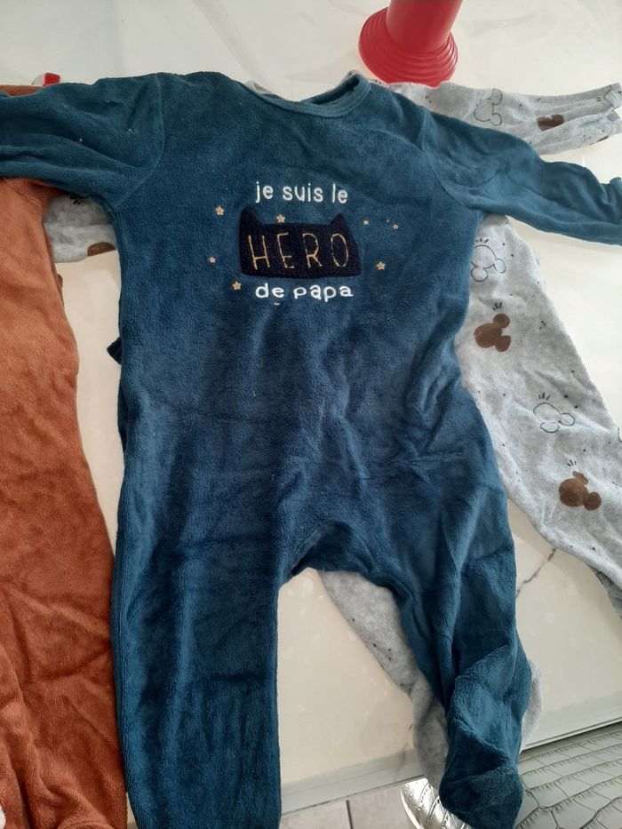 2 pyjamas orchestra 12 mois (Super man un peut usée voir photo) 2 pyjamas kiabi 12 mois 5euros les 4 pyjamas