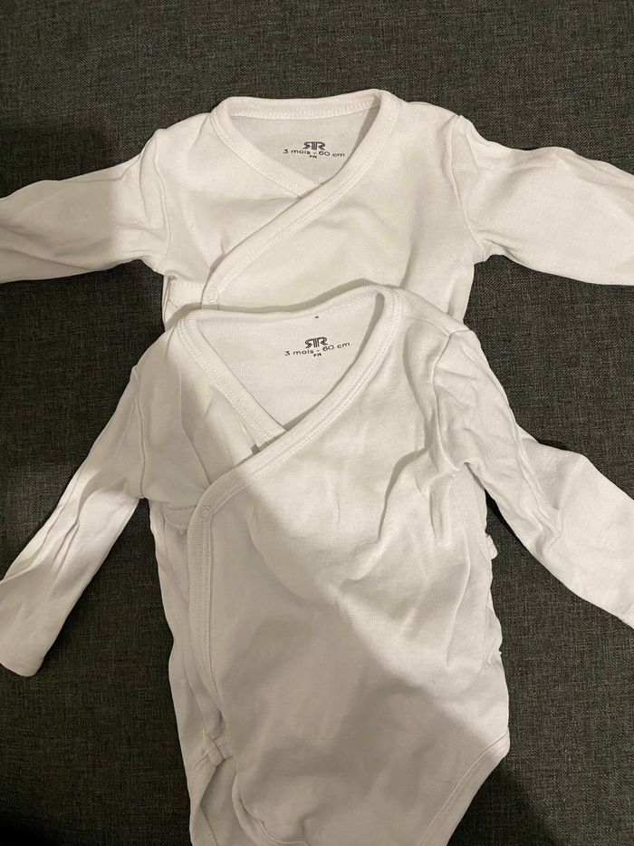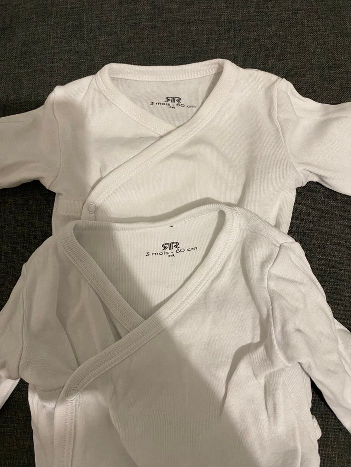 Lot de 2 bodies blancs taille 3 mois, s’ouvre pas devant, ont pas mal été portés mais en très bon état