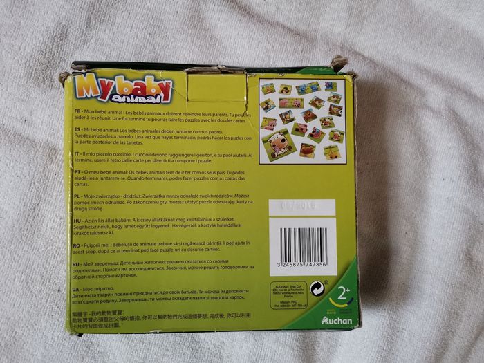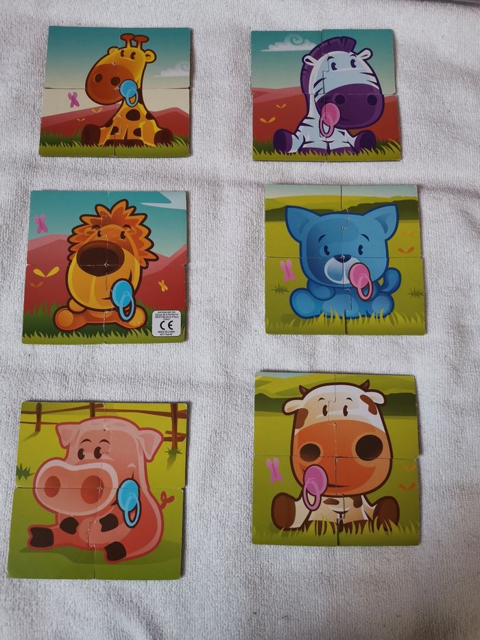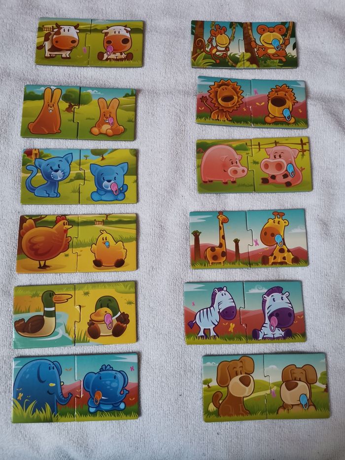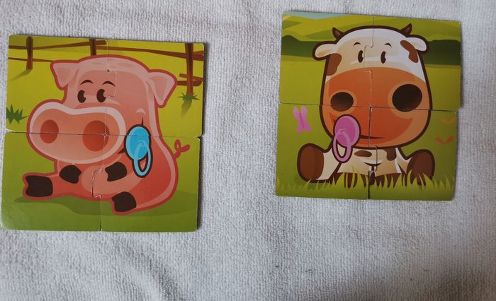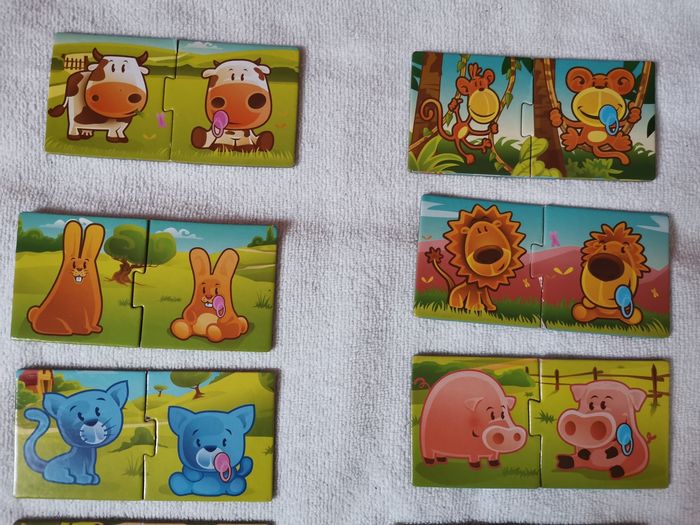 Puzzle en carton my baby animal de rik&rok. Boîte abîmée. Puzzle servis plusieurs fois, présentent des accros voir les photos. Utilisables des 2 faces. À partir de 2 ans.