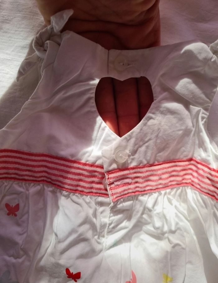 Neuve sans étiquettes. Belle petite robe avec le derrière en cœur au niveau de la fermeture. Voir photo avec ma mais. Petit papillons 🦋 et nœuds tous jolie 😃