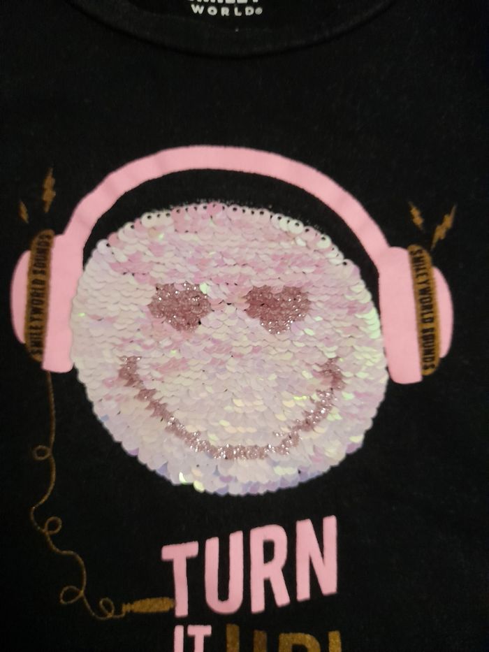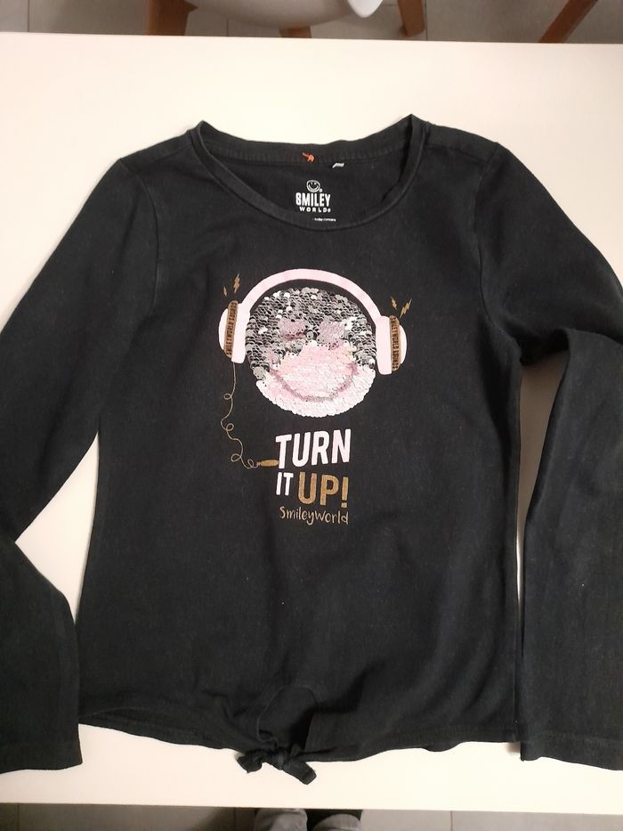 T-shirt manches longues noir avec un smiley en sequins réversibles. Taille 8 ans (128 cm)
