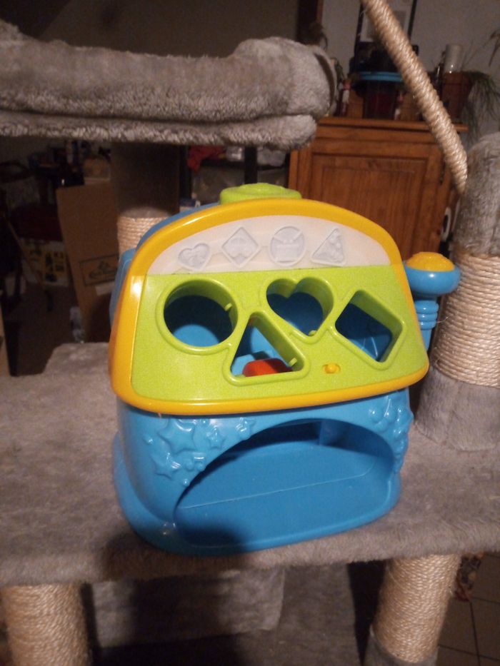 Jeux où bébé dois introduire les bonnes formes dans le bon emplacement. Très peu servi. Fonctionne avec des piles.