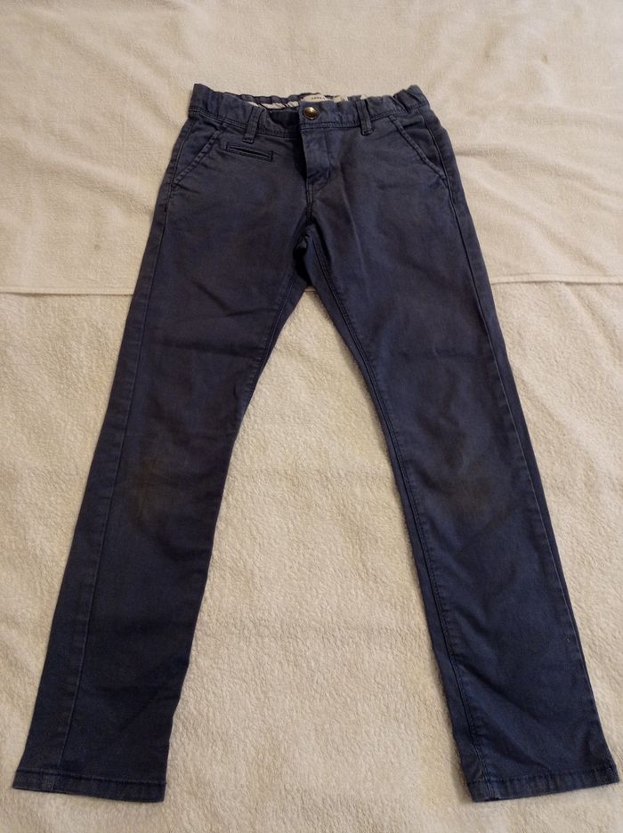 Pantalon en toile bleu taille 8 ans 128 cm bon état porter trois fois deux poches derrière deux poches devant réglage à la taille - photo numéro 1