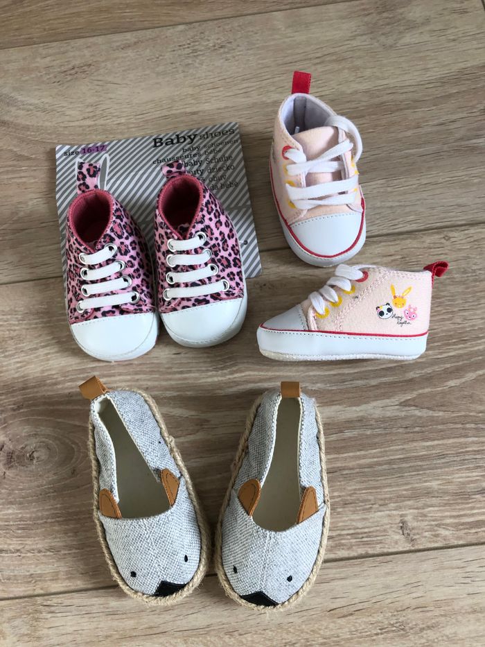Lot de 3 paires de chaussures bébé en parfait état (jamais portées) : - 1 paire style baskets rose avec petits animaux InExtenso (16) - 1 paire style baskets motifs panthère roses 16/17 - 1 paire d’espadrilles animaux Zara 16/17