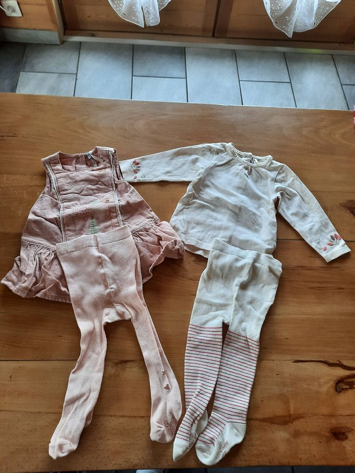 Ensemble Orchestra comprenant : 1 robe rose entièrement doublée. Taille 6 mois/67 cm. Matière 100% coton. Entièrement boutonnée au dos. 1 t-shirt manches longues. Taille 6 mois/67 cm. Matière 95% coton, 5% élasthanne Entièrement pressionné au dos. 2 paires de collants assortis. Taille 17/18.