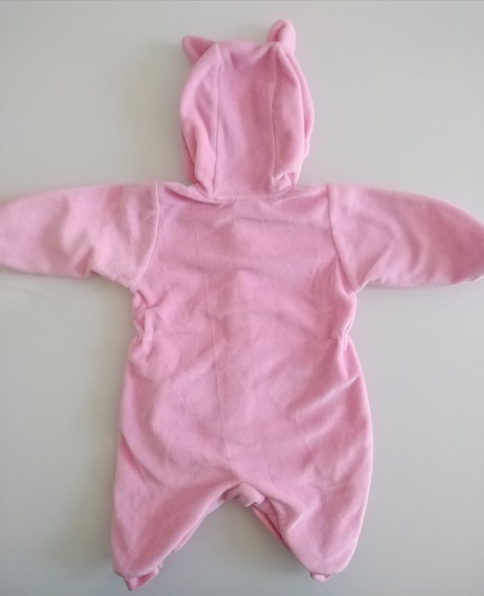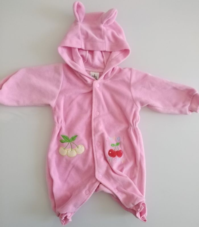 Surpyjama rose avec dessin cerises, boutons pressions sur le devant, sans pied, capuche avec oreilles dessus Marque ORIGINALE Très bon état, pas de tâche