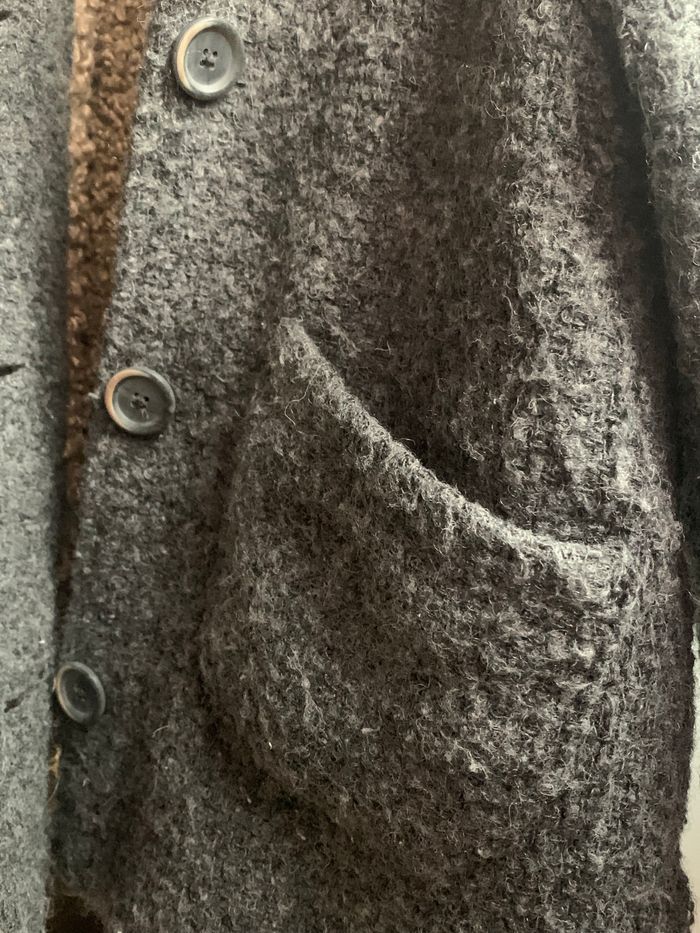 Manteau gris anthracite en mélange de laine effet mouton avec capuche > Fermeture par boutons > Deux poches devant doublées comme pour les manches > Effet liquette sur les côtés > Taille 4/5 ans - 110 cm