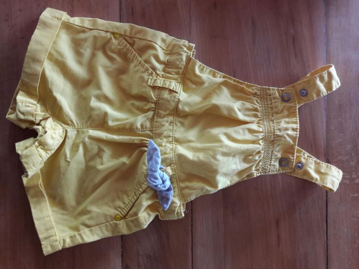 Salopette-short Okaïdi/Obaïbi jaune. Taille 3 mois/59 cm. Matière 100% coton. Ouverture pressionnée à l'entrejambe. Bretelles réglables en hauteur grâce à 2 pressions.