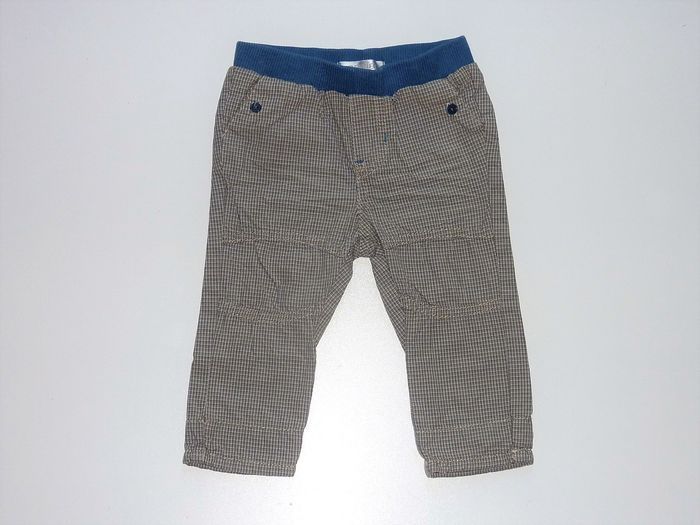 Pantalon de marque OBAIBI imprimé à discrets carreaux noisettes, ceinture élastique bleue pour plus de confort. Etat excellent.