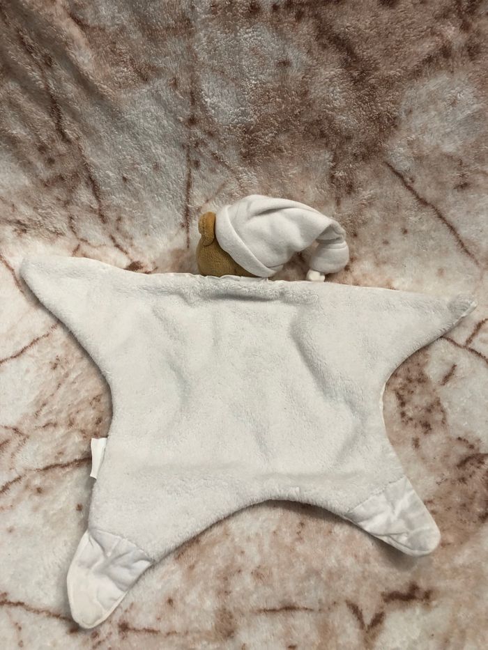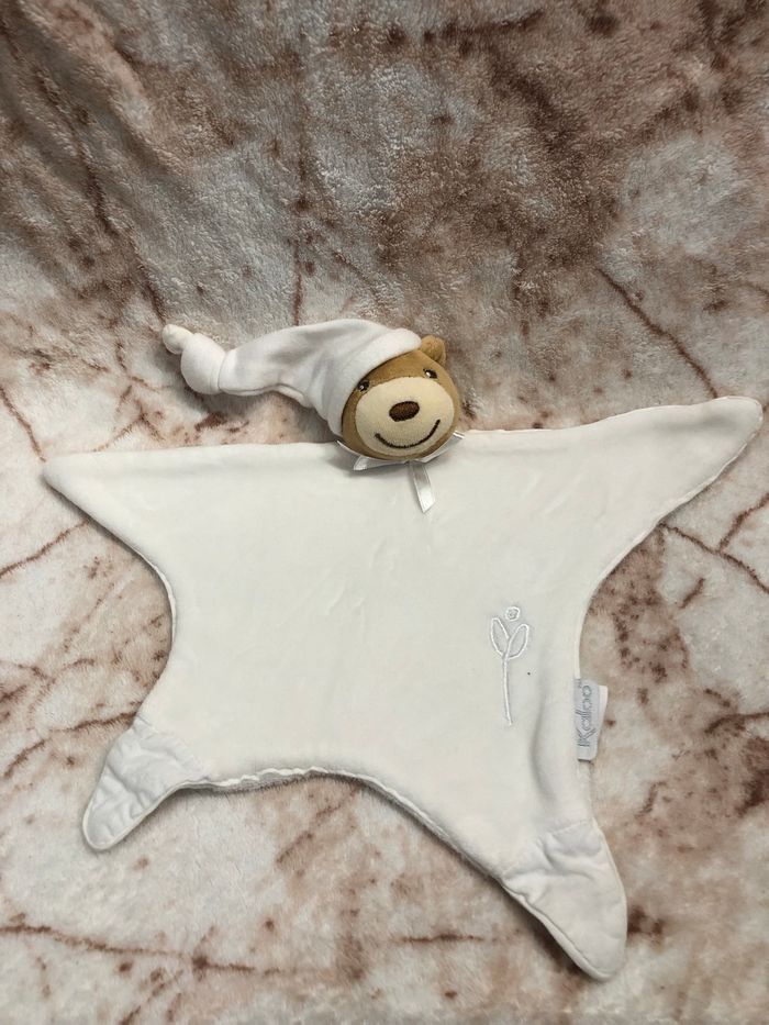Doudou plat étoile blanc Tête de ours marron Bonnet blanc En broderie une fleur +/- 26 cm Kaloo Occasion en très bon état Vous achetez le doudou que vous voyez sur la photo