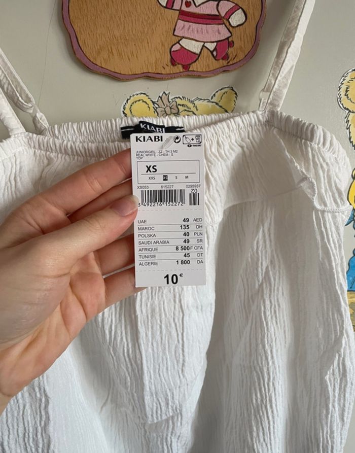 Top blanc à bretelles, taille 14 ans, marque Kiabi. Taille Xs qui correspond à la taille 14 ans.