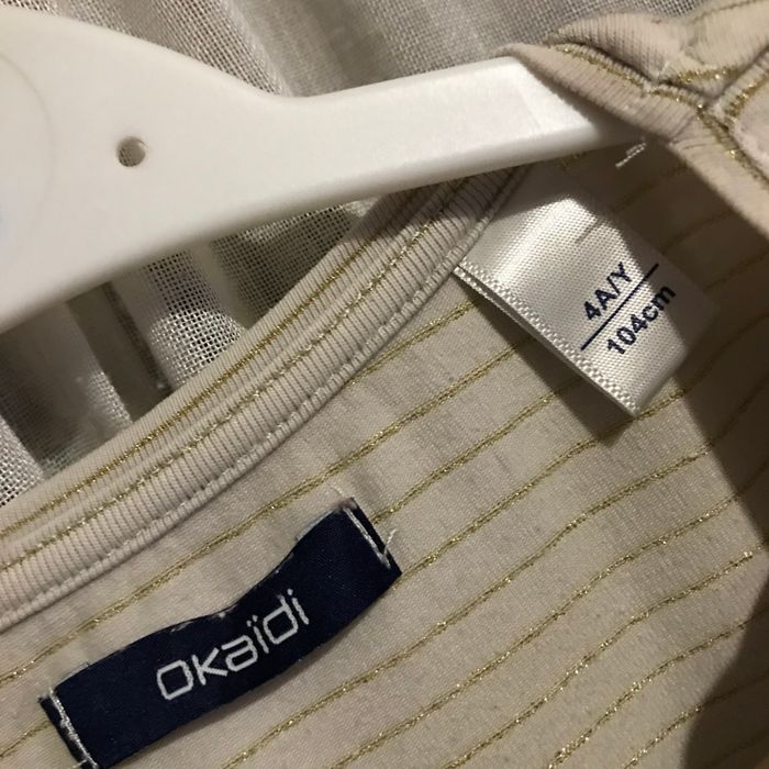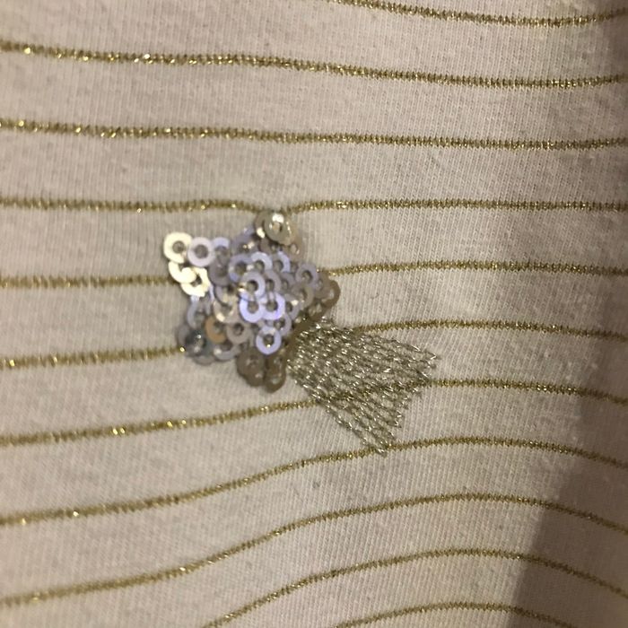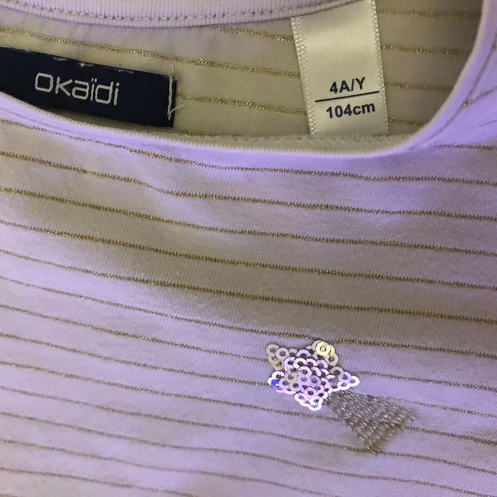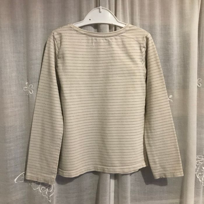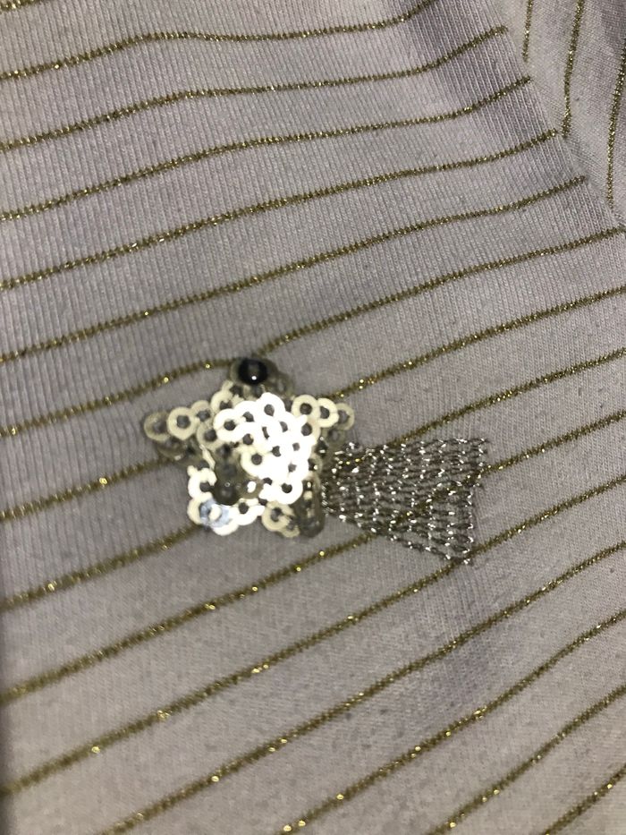 T-shirt beige rayé or Etoile filante sequins et fil argenté niveau poitrine Taille 4 ans 104 cm Okaidi Taché sur un poignet