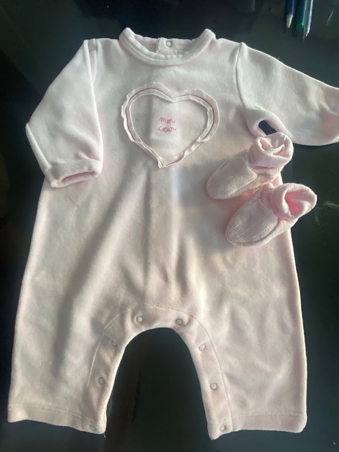Grenouillère bien chaude velours, petit bateau avec paire de chaussons, trois mois dégrif