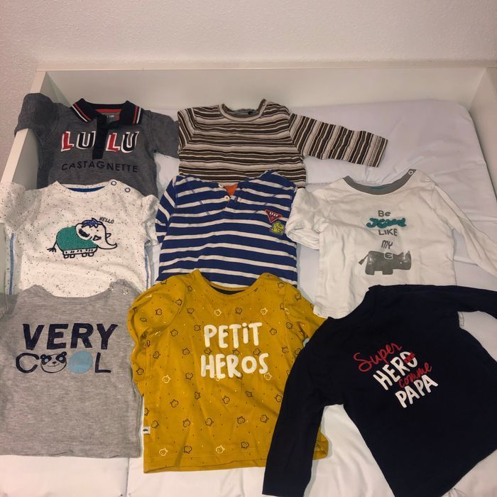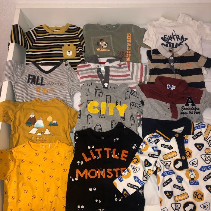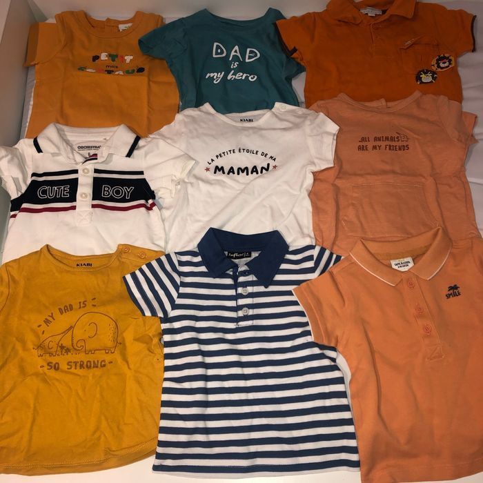 Vêtements TOUT NEUF Tout en taille 6 mois - 5 tee-shirts 👕 - 4 polo 👕 - 20 pull manche longue 🛍 - 5 salopettes 🎀 - 3 pantalons 👖 - 2 shorts 🩳 TOUTE MARQUE: Orchestra, tao, inflex, creeks, kiabi etc 🧸