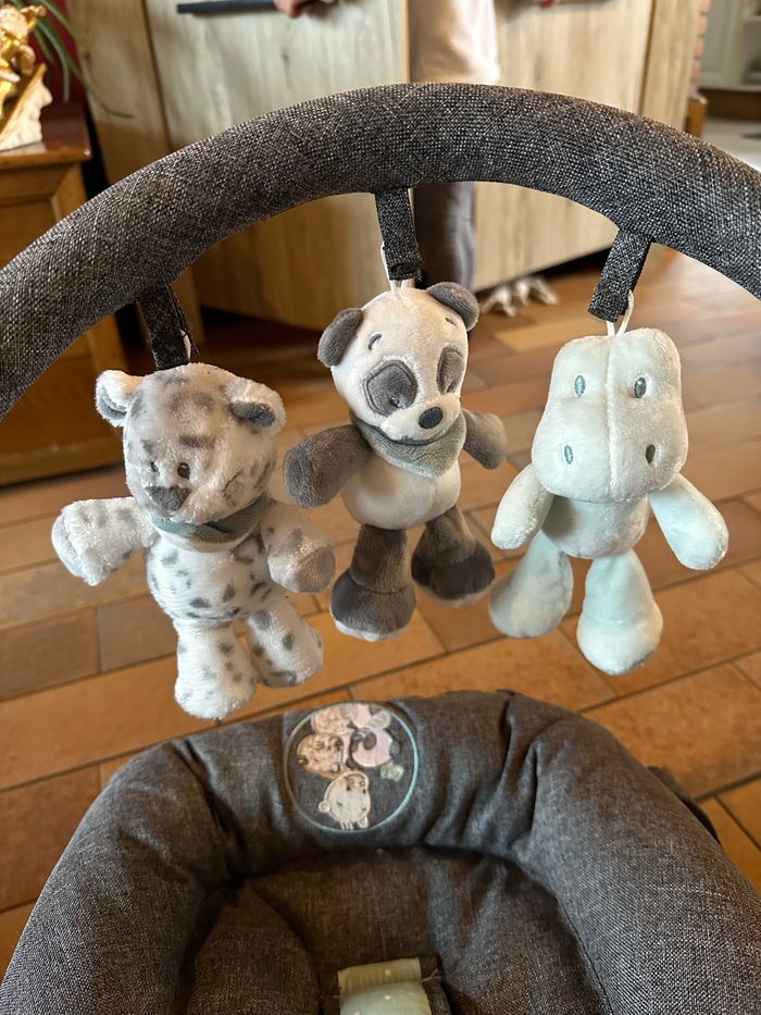 État irréprochable Collection Loulou, Léa et Hyppolyte Utilisé une ou deux fois pas plus. Acheté en 2020 Réglable en position couchée ou assise et vendu avec le portique et ses 3 peluches assorties au transat Facilement transportable car très léger et dispose de 2 lanières de transport latérales Attache 3 points et petit coussin pour la tête :)