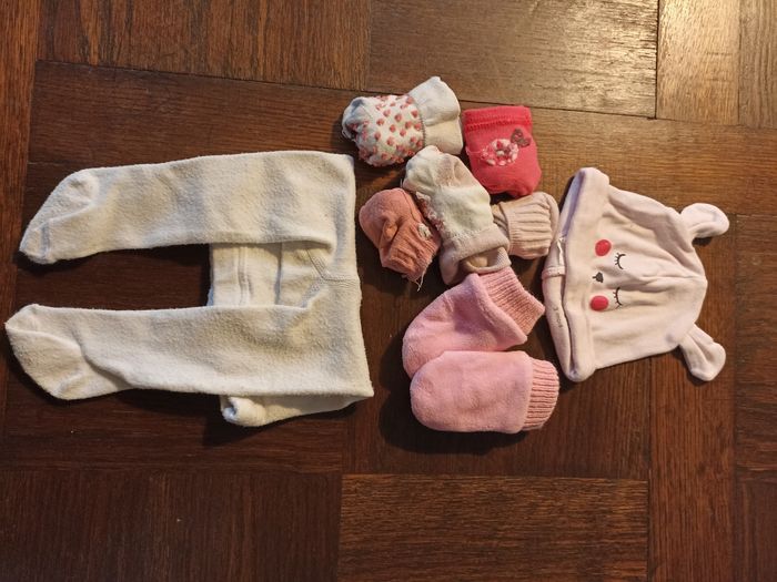 Ce lot comprend : 1 Bonnet 1 paire de moufle 5 paires de chaussettes 1 collant