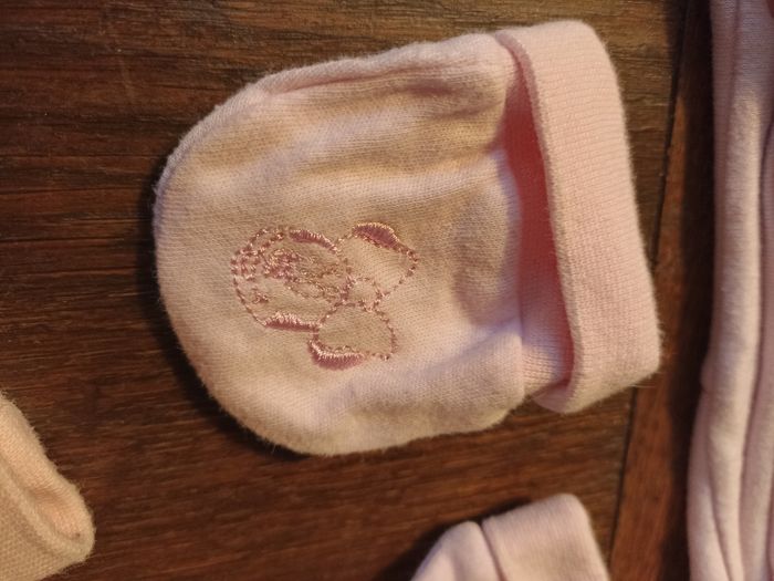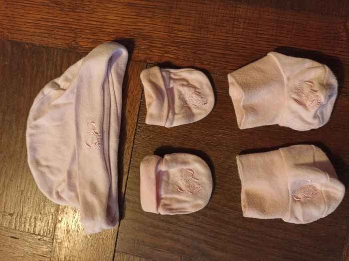 Ce lot comprend : 1 bonnet 1 paire de moufle 1 paire de chaussons 1 chapeau