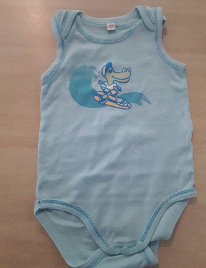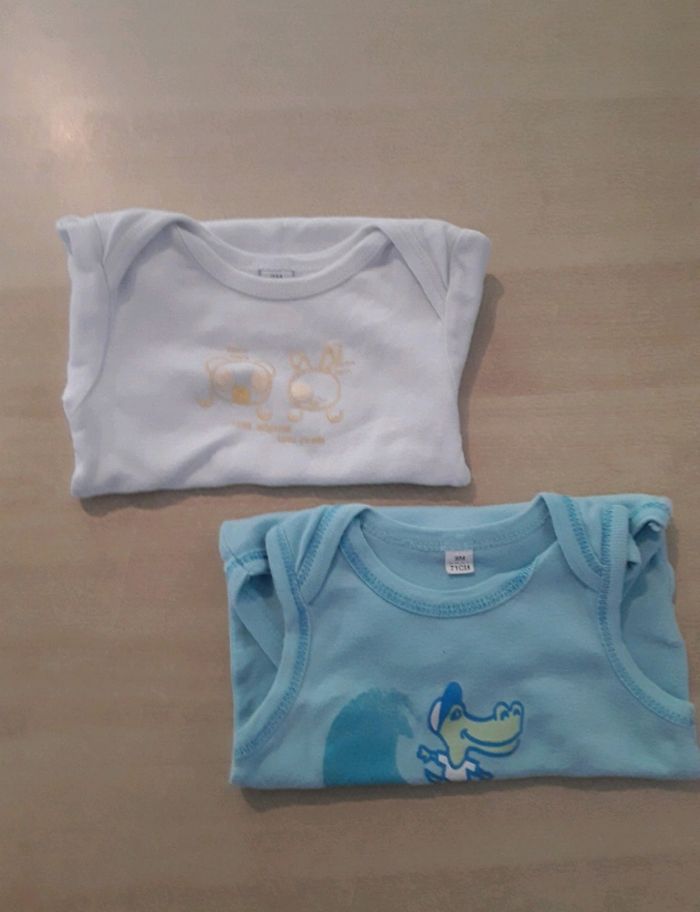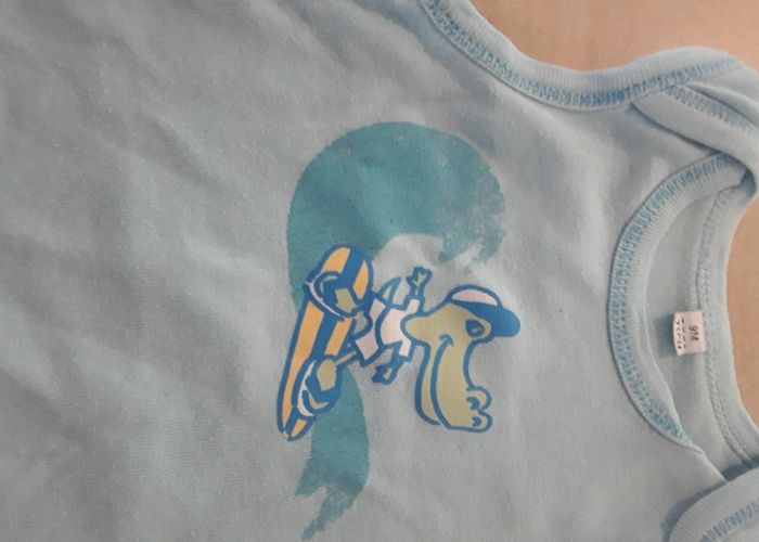 2 bodies ( un manches courtes l'autre débardeur). Le bleu a le flocage légèrement effacé (cf photo) #stev9moisgarçon