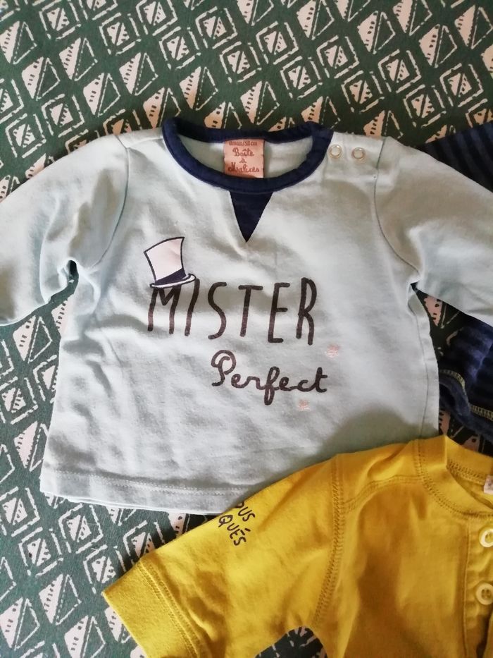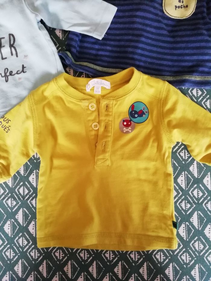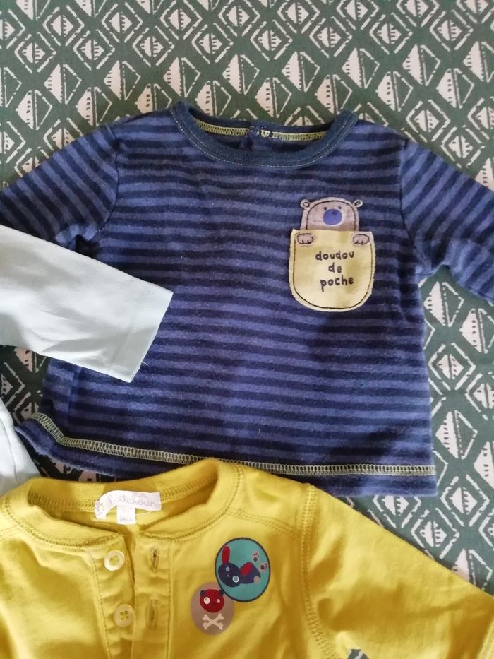 Lots de 3 tee shirts taille 1 mois 1 tee shirts vert anis 1 tee shirts bleu clair 1 tee shirts bleu a rayure avec motif : doudou de poche