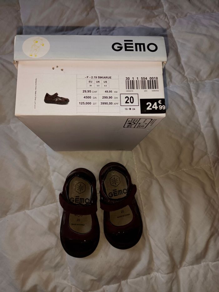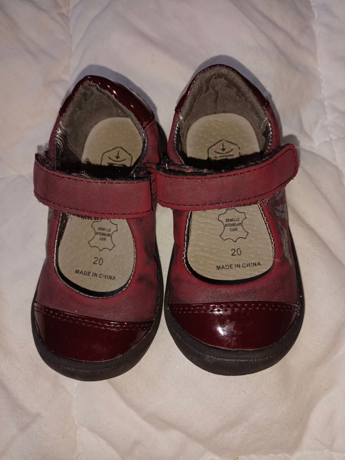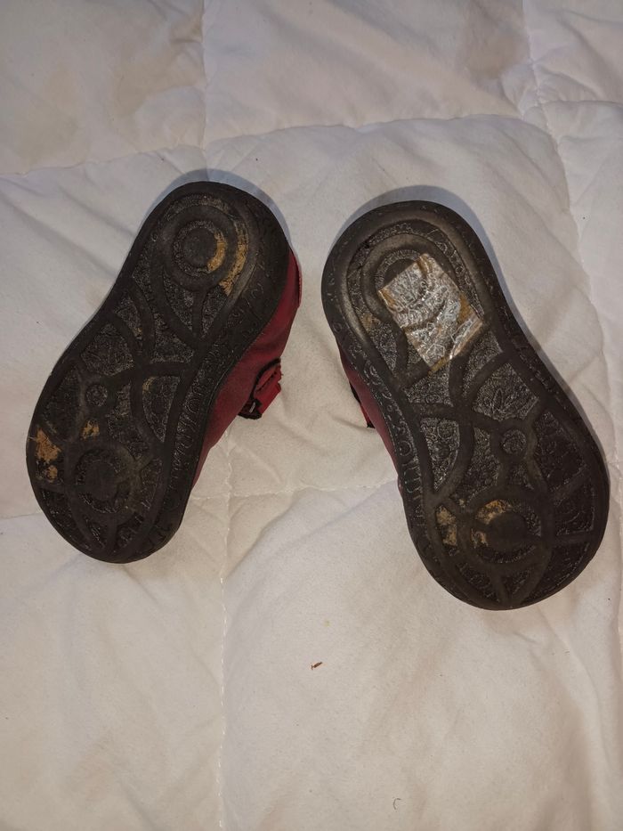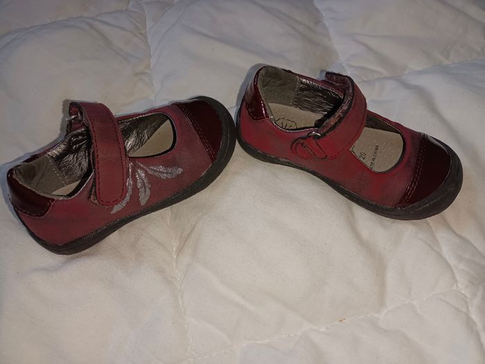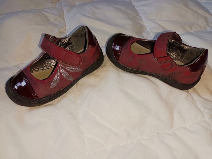 De chez Gémo Achetées en septembre dernier Peu portées (mademoiselle se préfère pieds nus ou en chaussettes) Très bon état Coloris bordeaux et plumes argentées Fermeture scratchs Vernies par endroit Pointe du pied renforcée et protégée (pratique si bébé fait encore du quatre pattes) Talon renforcé et cheville tenue à l'intérieur et à l'extérieur Envoyées dans leur boîte d'origine