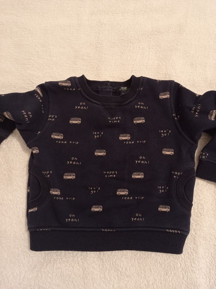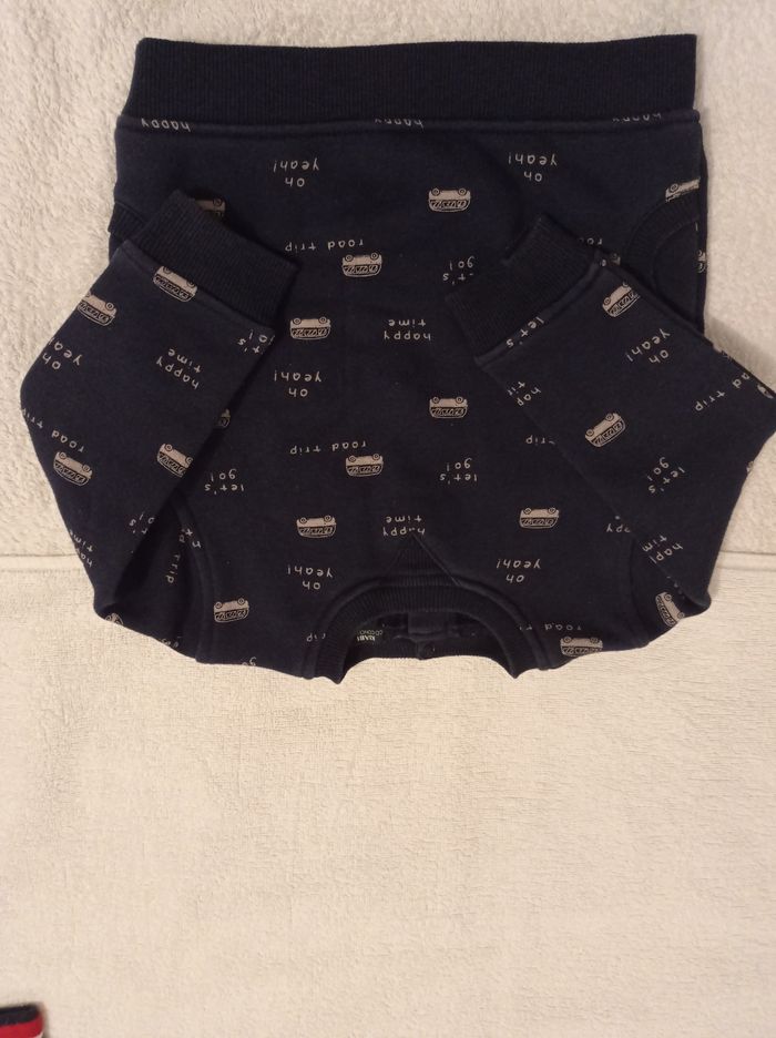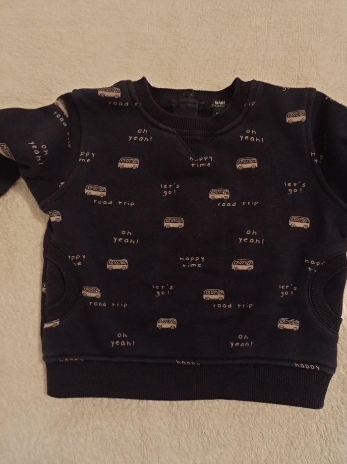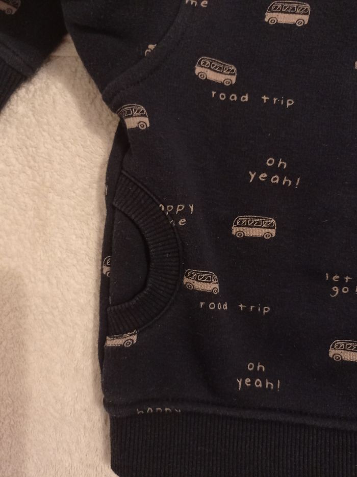 Pull manche longue bleu avec petit motif car en blanc l'intérieur doudoune 3 pressions dans le dos marque Kiabi taille 18 mois 77 82 cm avec deux poches