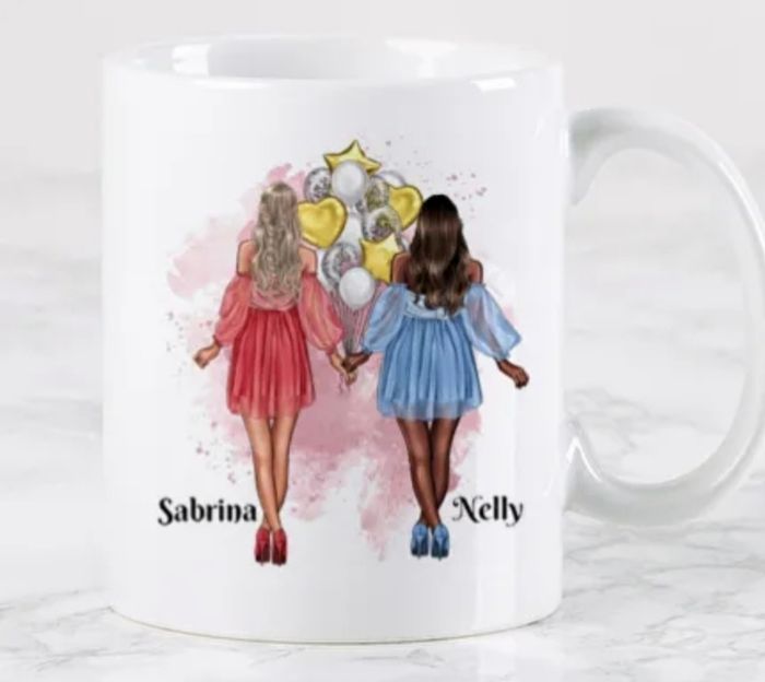 Mug meilleur amie, mug anniversaire personnalisé. Vous pouvez choisir la couleur de la robe, des cheveux, de la peu, du fond et des ballons. N'hésitez pas Privilégier shop2shop pour un envoi plus rapide