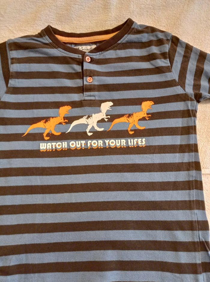 Collection  .U taille 6 ans pull manches longues rayé bleu rayé gris clair voir photos avec motif trois dinosaures