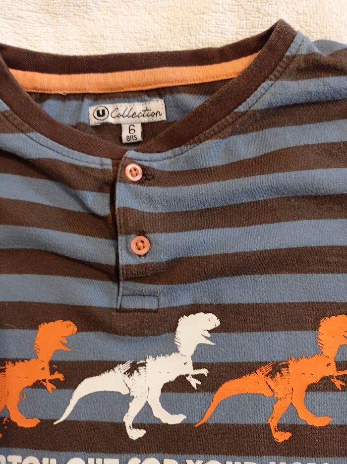 Taille 6 ans pull manches longues motif dinosaure avec trois boutons sur le devant collection U