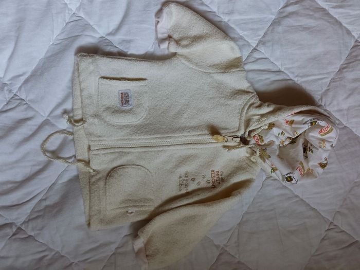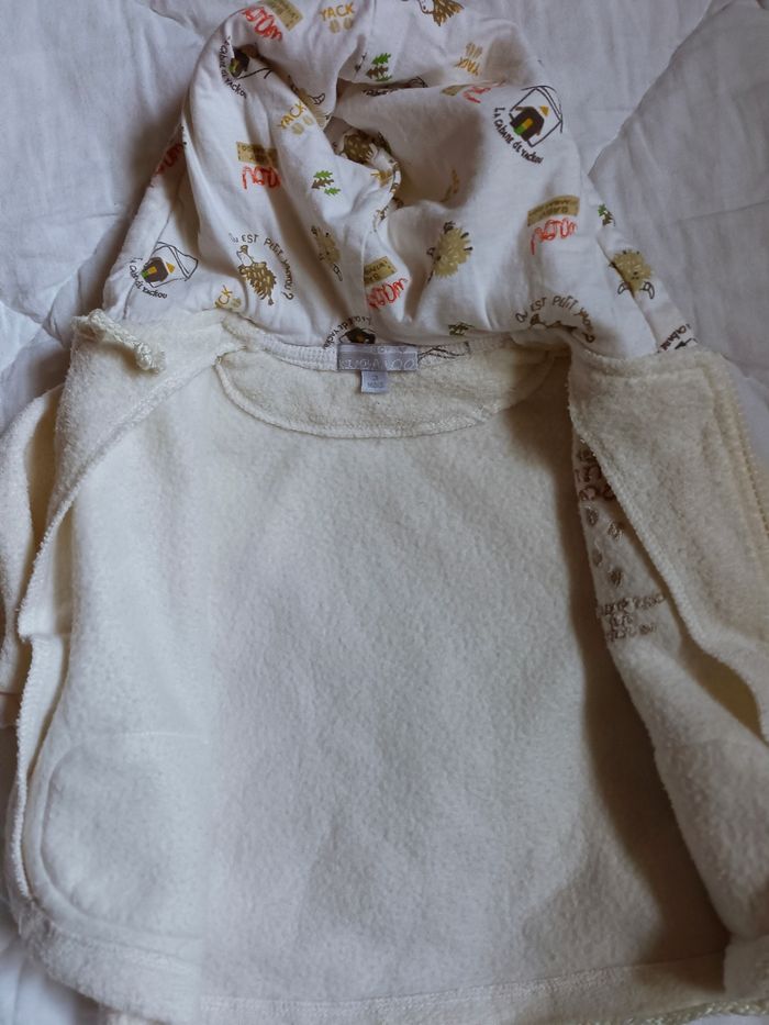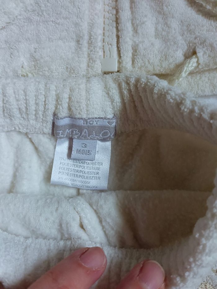 Velours bouclette tout doux crème Pantalon et veste coordonnée Marque Kimbaloo Taille 3 mois/60 cm Veste fermée par fermeture éclair Pantalon ajustable par lien Excellent état Veste capuche doublée à la tête