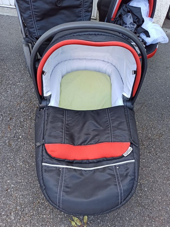Vends trio peg perego composé de : Une nacelle avec matelas et draps et alese, attache pour fixer dans la voiture, moustiquaire. Un cosy avec protection de pluie et base Isofix pour la voiture. Une poussette positionnable face ou dos a la route avec protection pluie. Une ombrelle Un sac à langer