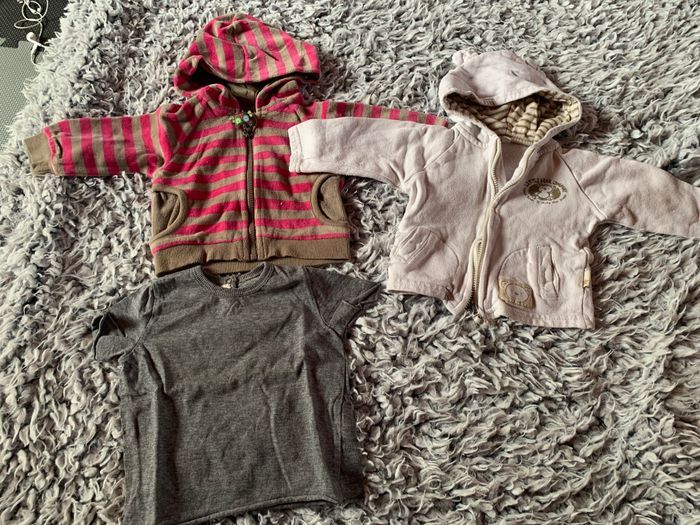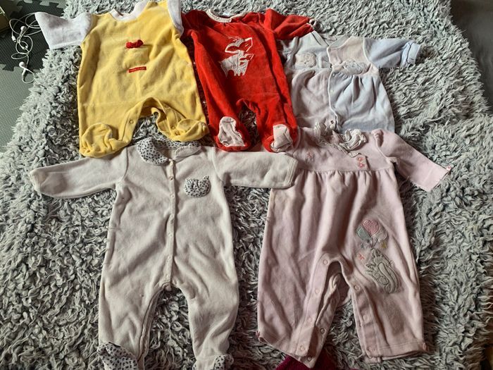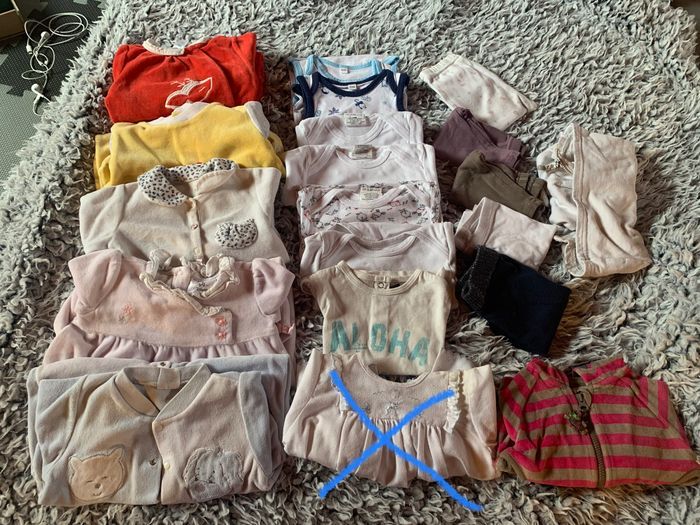 5 pyjama velours (Disney, sucre d’orge, obaidi, sans marque) 1 body manche longue Pommette 3 body manche courte Tissaia 2 body bretelle sans marque ( acheté à action) 2 t-shirt manche courte ( Babe&Tess, kiabi) 5 legging/ pantalon (kiabi, obaidi, Next, sans marque) 2 veste à capuche dont 1 velours ( sans marque et dpam)