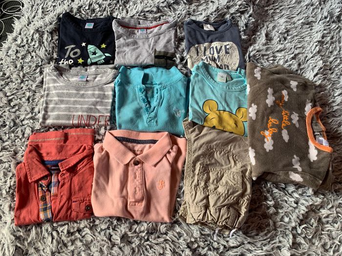 2 t-Shirt manche courte (kiabi, disney) 3 polo manche courte (primark, in extenso, sergent major) 3 t-shirt manche longue Tex 1 pantalon fin sans marque 1 pyjama velours 2 pièces Kitchoun