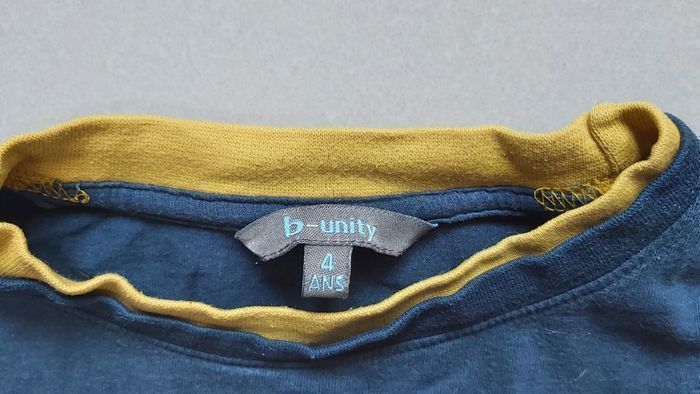 Tshirt manche longue Taille 4 ans Micro trou sur une manche voir dernière photo Couleur bleu avec motif Marque b unity