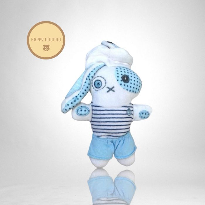 🧸 Peluche Doudou Lapin tenue de marin pirate bleu et blanc avec beret.