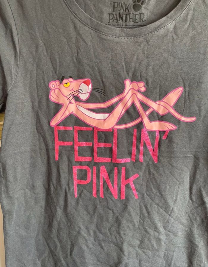 Tee shirt à manches courtes gris foncé à motifs, taille S, marque Kiabi. Taille S qui correspond à la taille 16 ans.