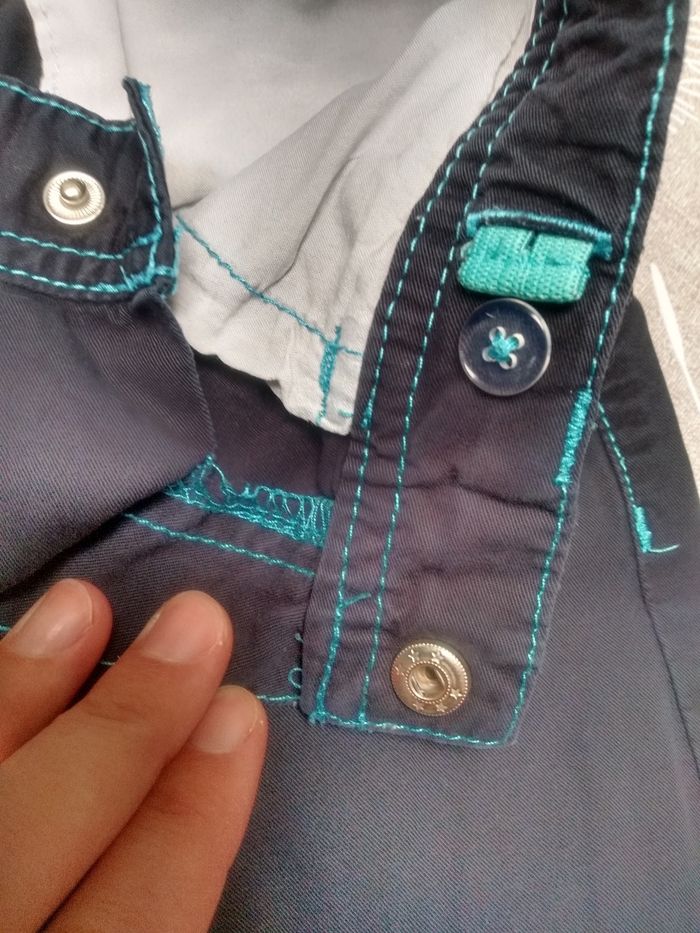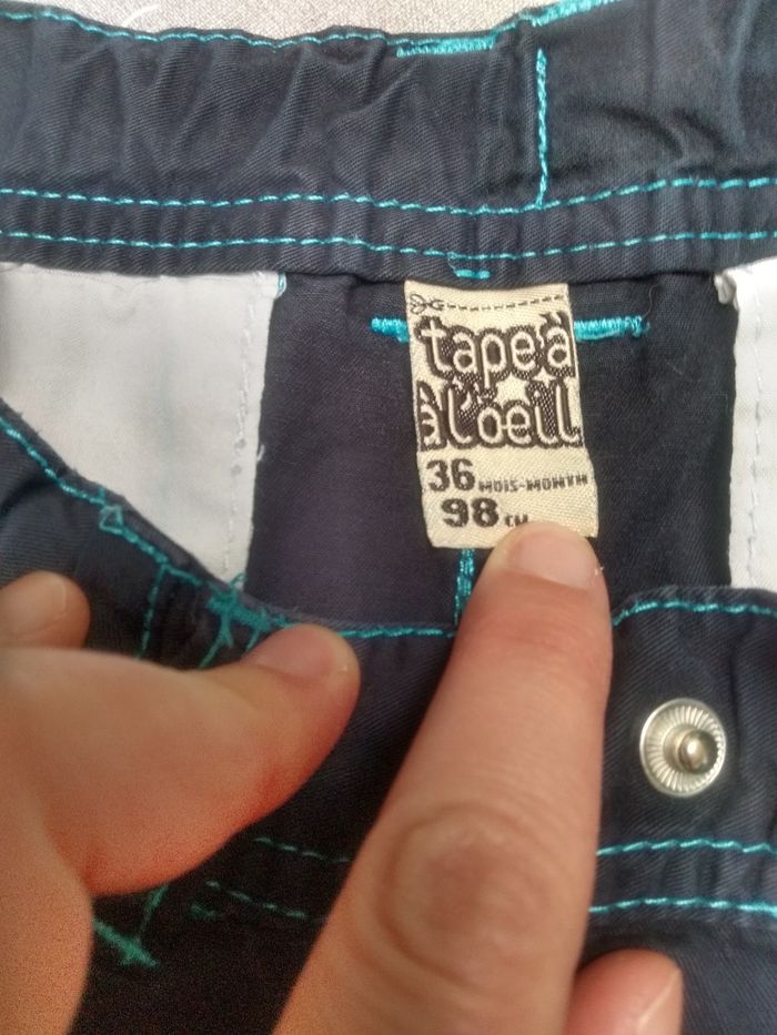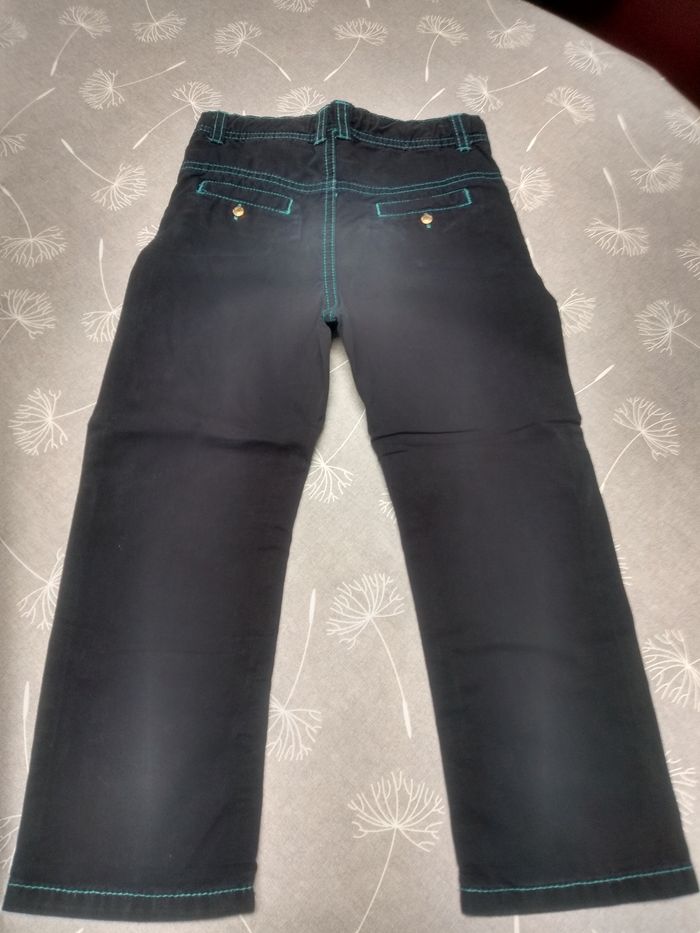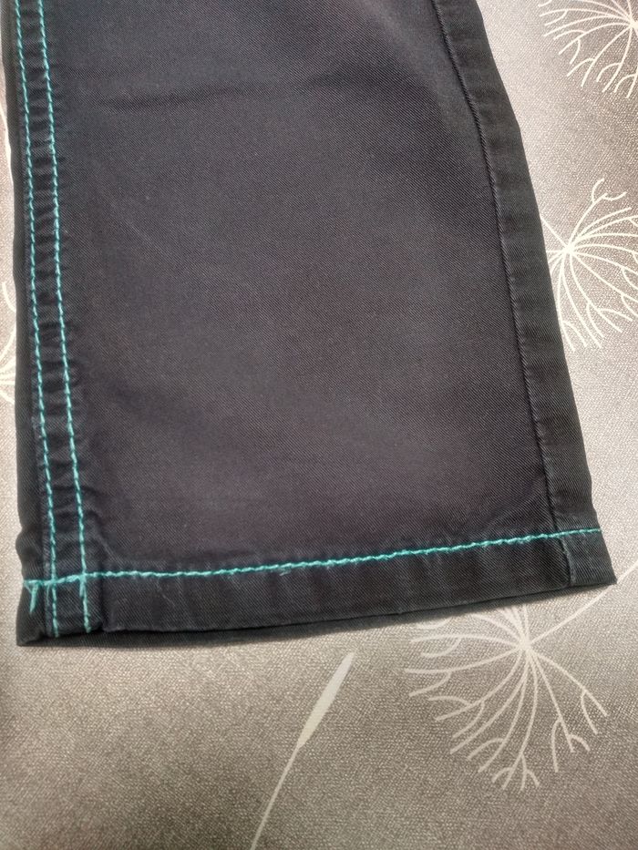 Pantalon droit bleu foncé avec couture bleue claire. Bouton à pression et taille réglable par élastique à l'intérieur. Taille 3 ans, 98 cm, Tape à l'œil. Etat impeccable. Bac 11