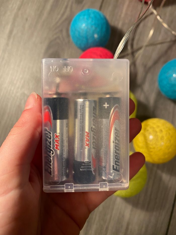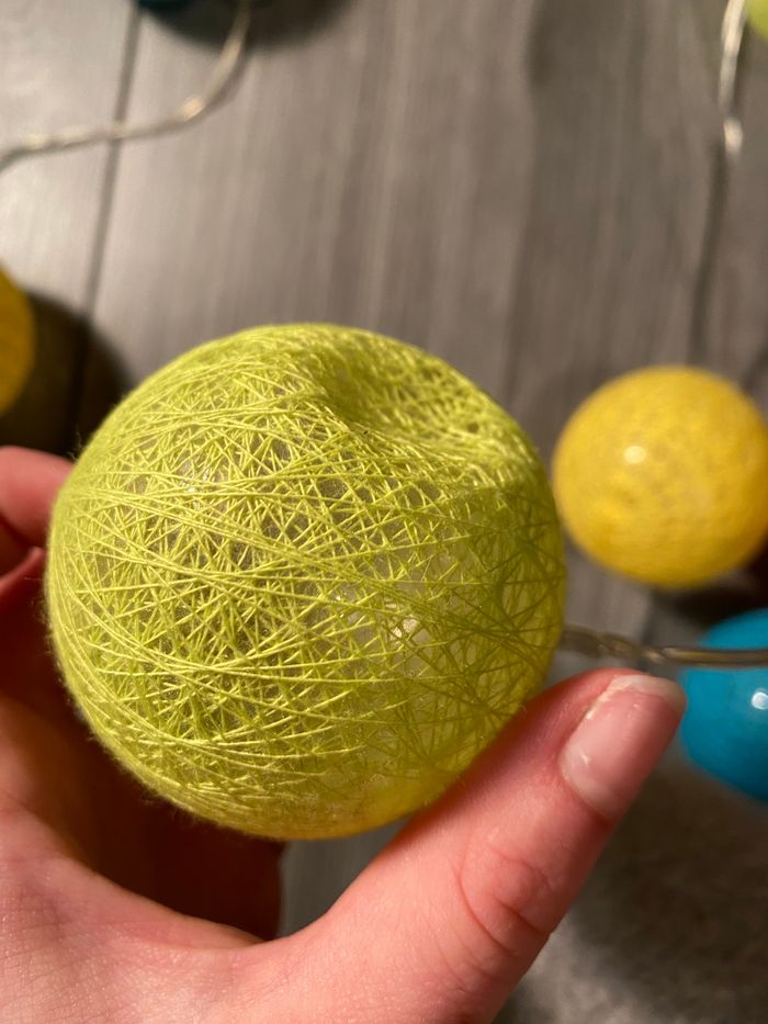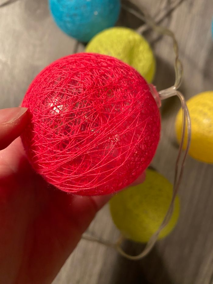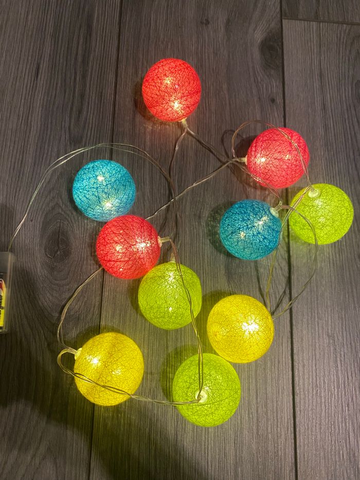 Cette guirlande est fournie avec les piles. La première boule et la dernière sont légèrement cassées (un morceau du plastique est tombé) mais les ampoules marche toujours. Pour plus de renseignements n’hésitez pas. Prix négociable.
