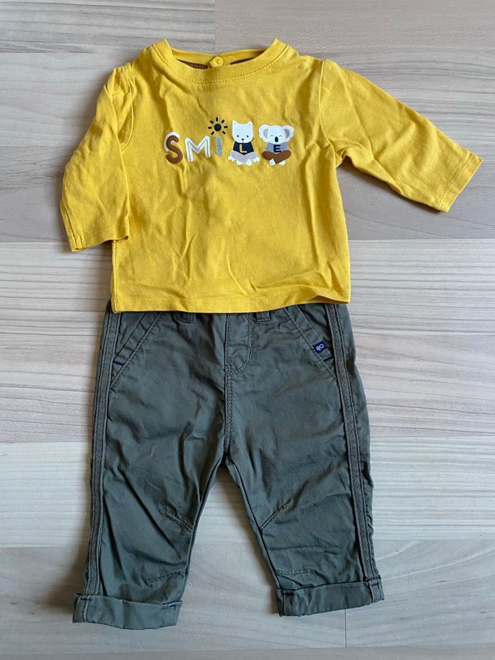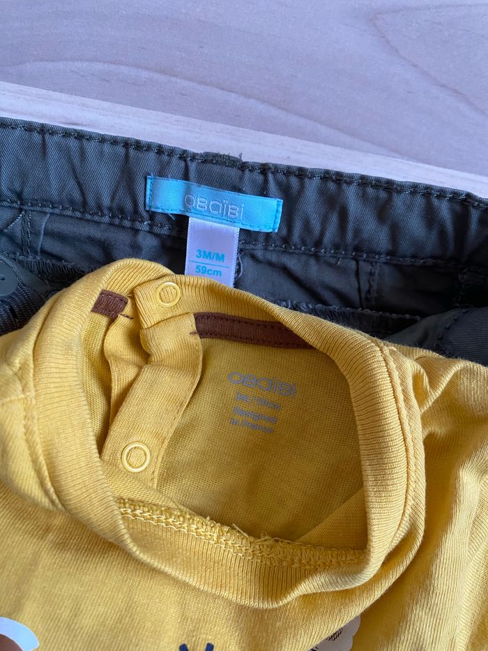 Ensemble t-shirt jaune et pantalon kaki de marque obaibi et de taille 3mois.