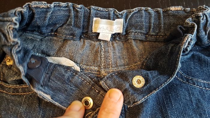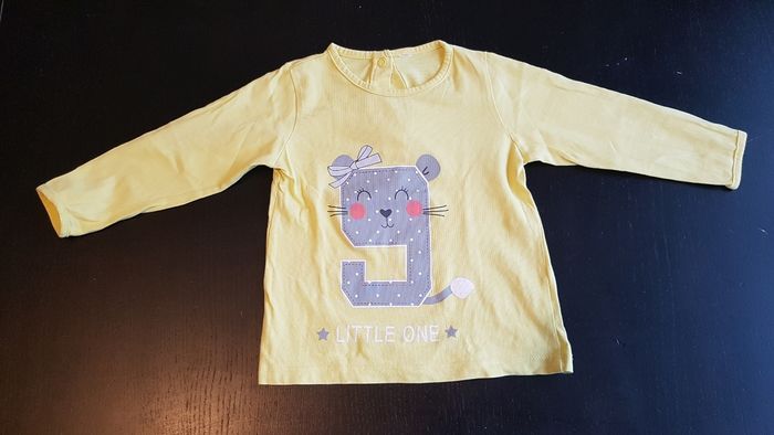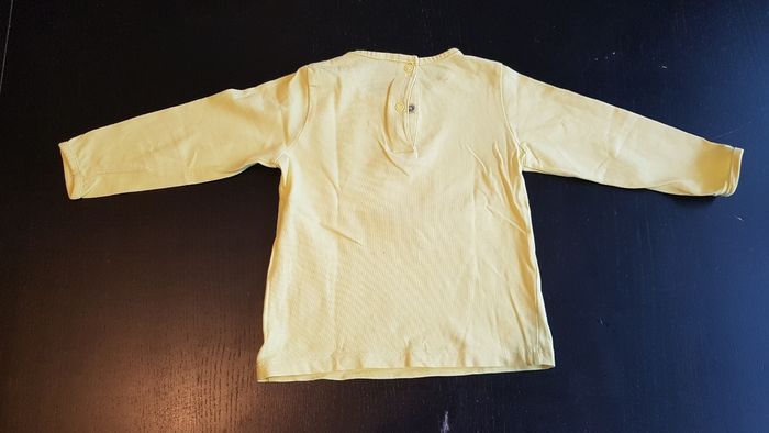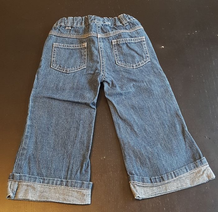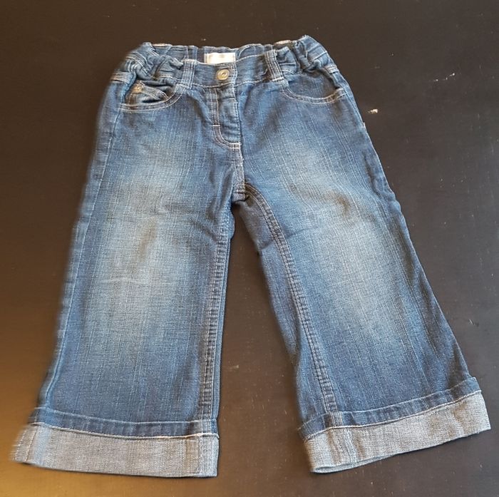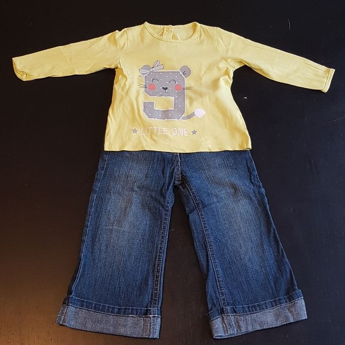 Ensemble jean style pattes d'eph + tee shirt manches longues. Le jean se ferme par un bouton pression et réglable à la taille. Marque Kimbaloo pour le jean et je ne sais pour le tee shirt. Taille 18 mois. En très bon état