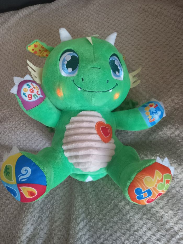 Jeu bébé dragon en peluche qui parle et chante... Bouton sur les 2 mains et les 2 pieds ainsi que son petit cœur