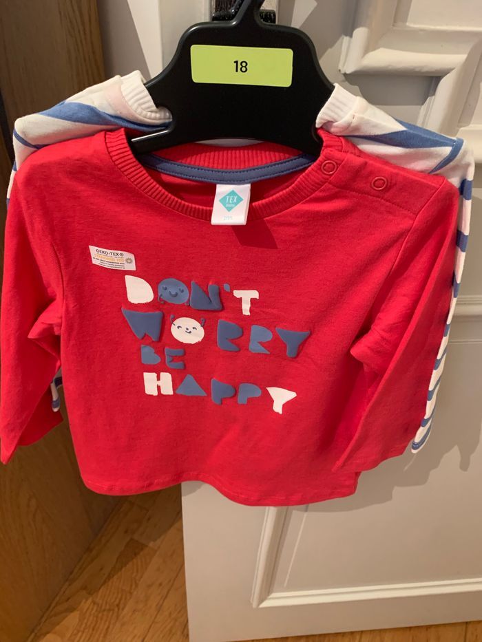 Teeshirt manche longue Un uni rouge /un rayé bleu blanc Lot de 2 18mois Neuf