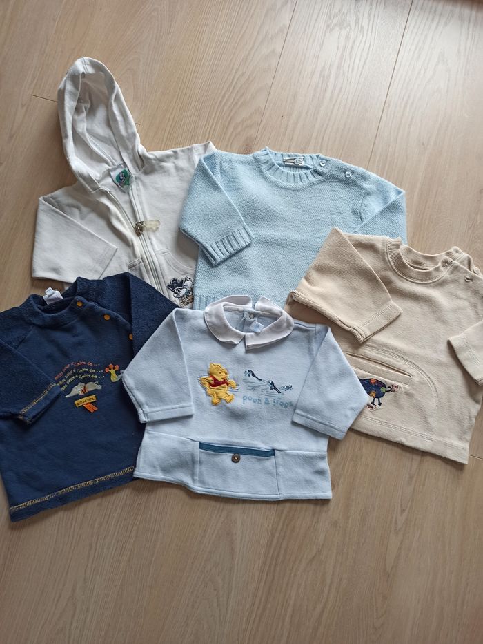 Lot de 4 pulls + 1 gilet 6 mois ( le beige taille un peu plus grand) Ensemble qui a bien vieilli mais peu encore être porté, pas de trou. Juste le gilet blanc à jauni Marque Disney, Looney toons, absorba et 2 sans marque