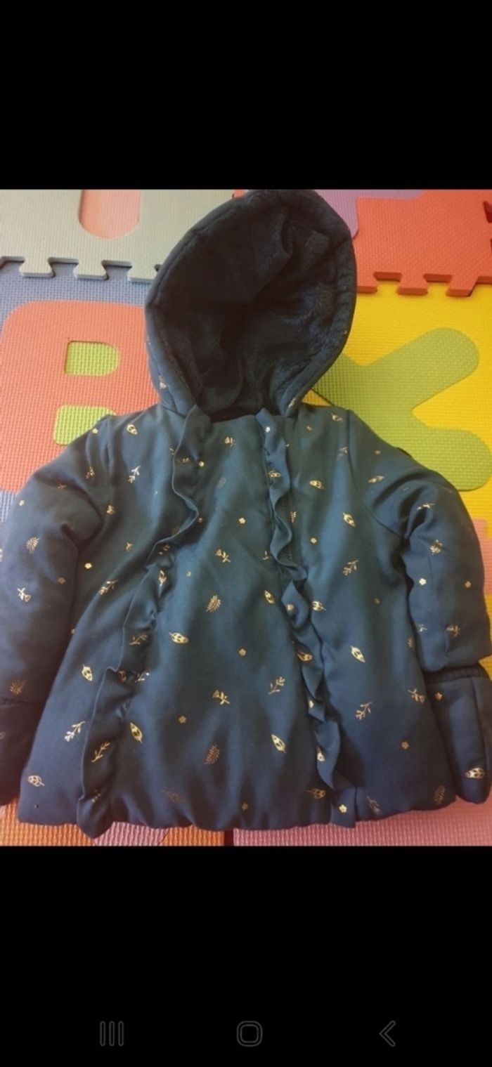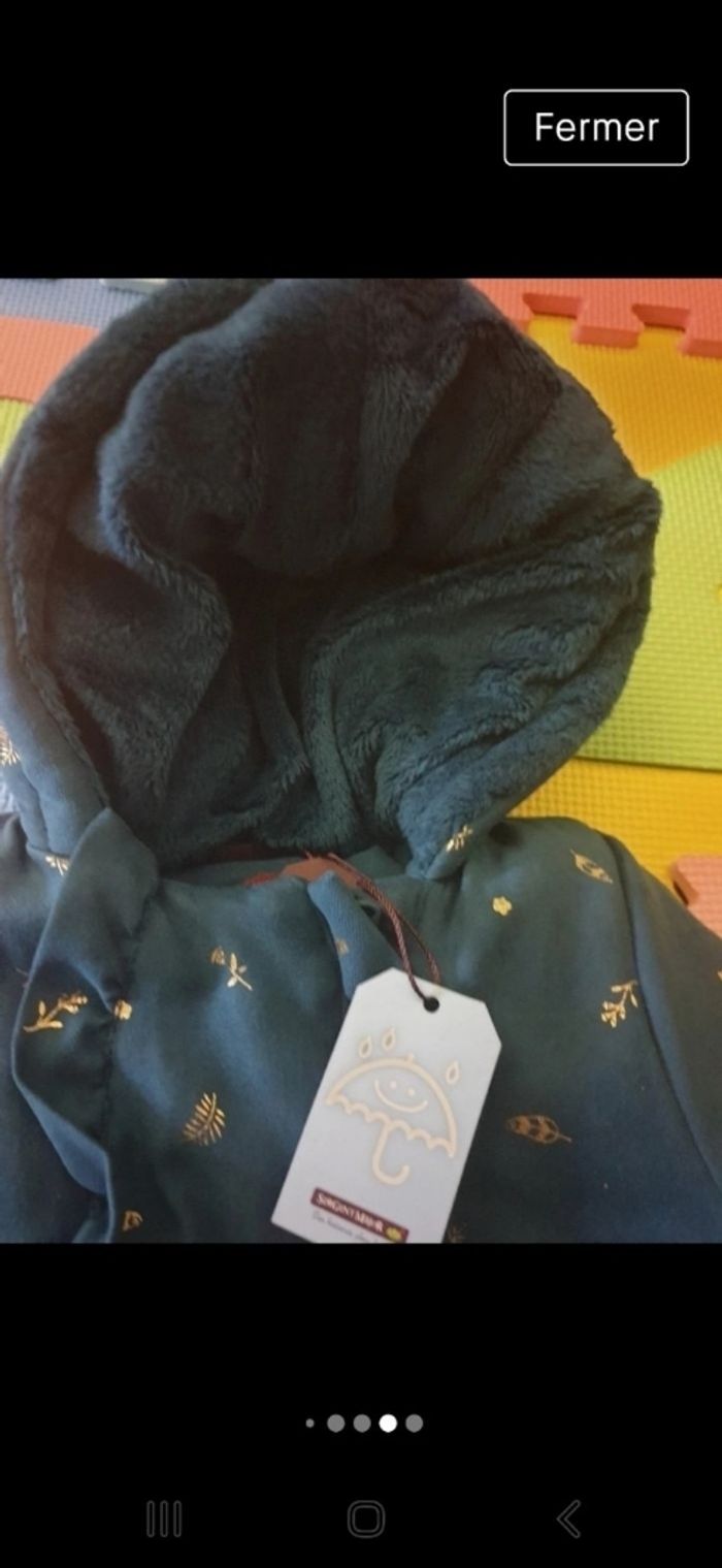 Doudoune toute fourrée, très chaude imperméable, avec ses gants amovibles. Taille 9 mois jamais portée, encore étiquetée.