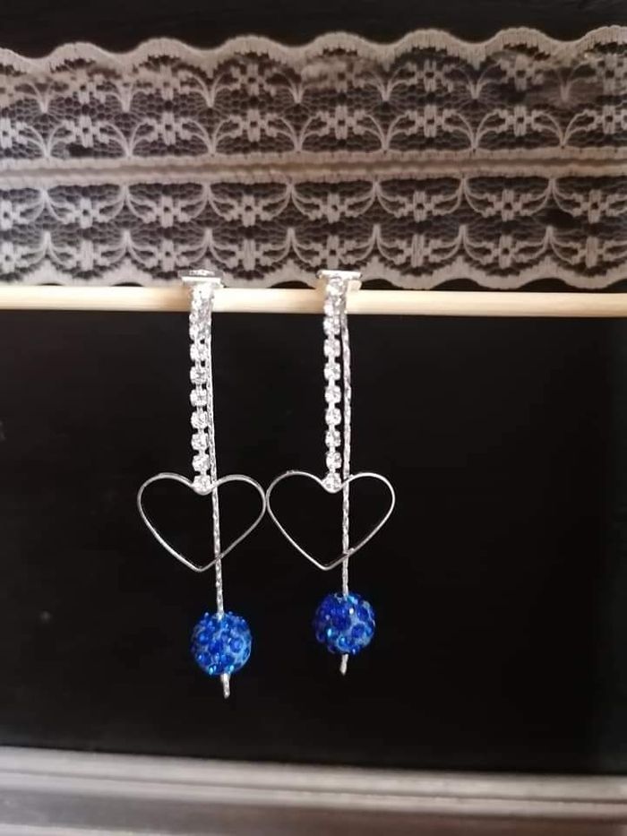 Boucles d'oreilles clip (sans trou) strass blancs boule bleue et cœur argenté jamais portées