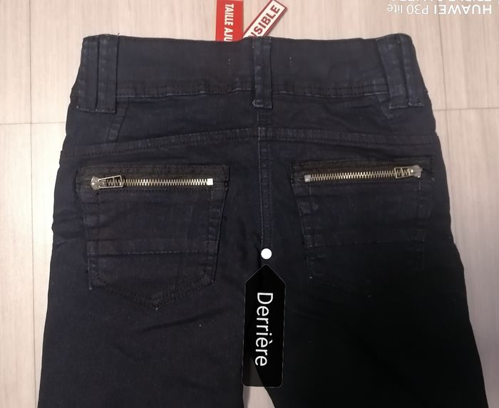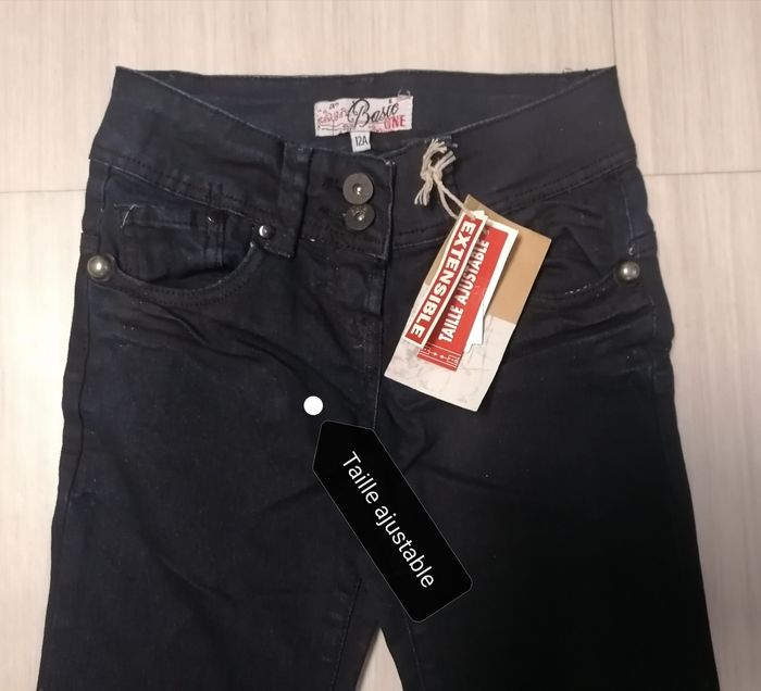 Jeans fille Basie One 6ans. Bleu marine 2 poches derrière avec fermeture. 2 poches devant. 80%coton. 18%polyester. 2%elasthane. Extensible. Taille ajustable. Neuf. 6.50€