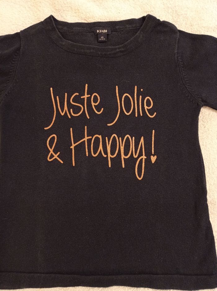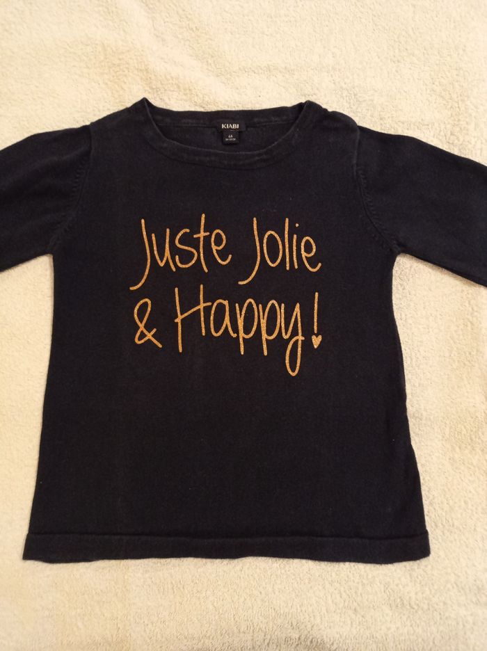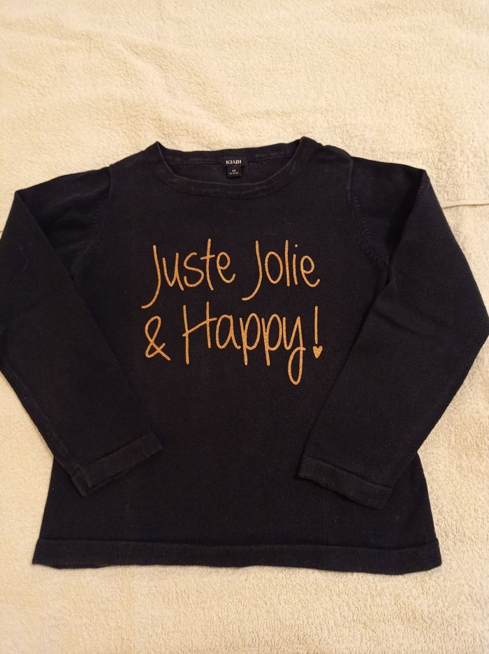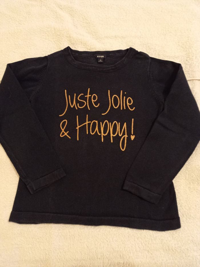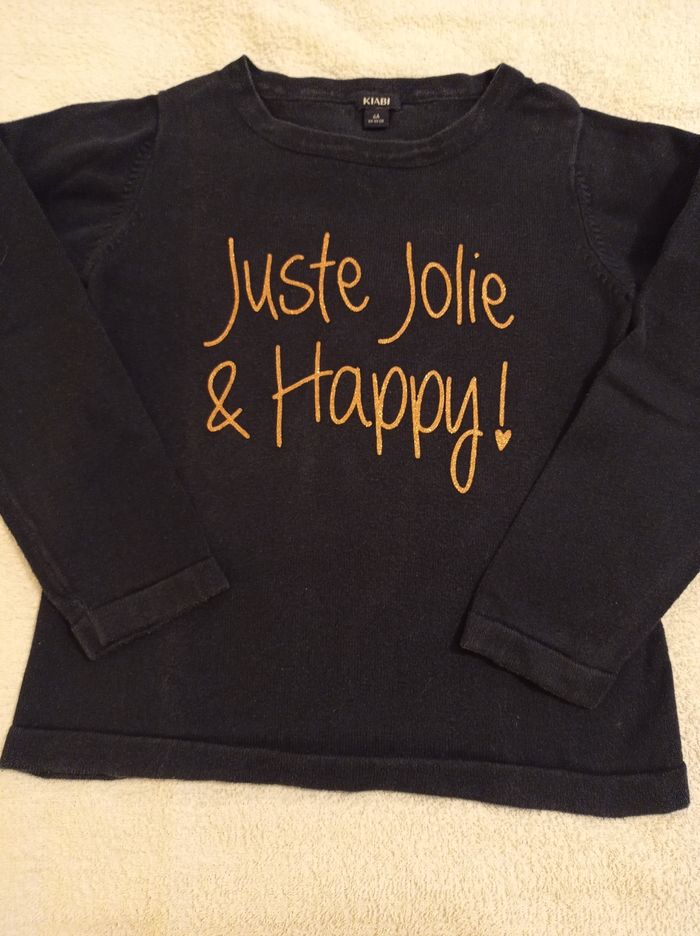 Pull en laine bleu pour fille chaud inscription devant en brillant juste jolie happy inscription brillante voir photos marque Kiabi taille 6 ans 114 119 cm - photo numéro 1