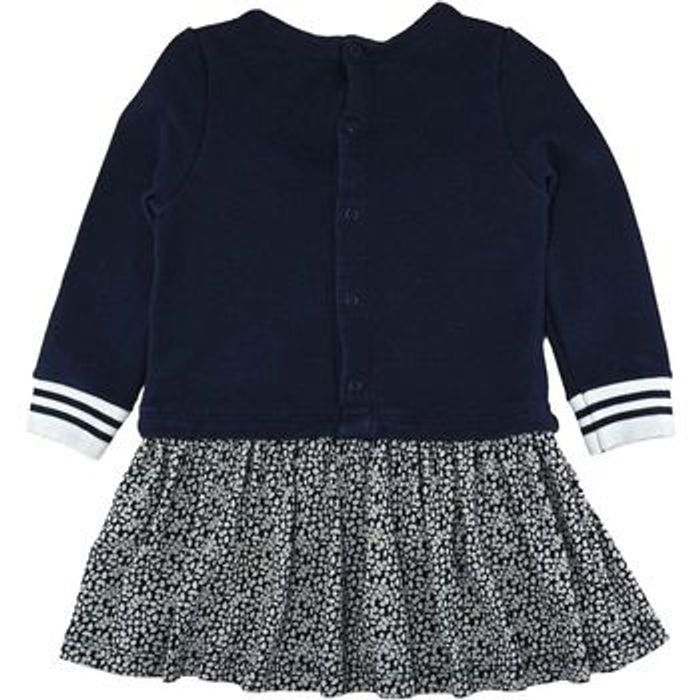 DESCRIPTION : Coloris : Bleu, Gris, Beige Taille : 18 mois Saison : Toutes saisons Genre : Fille DÉTAILS : Ouverture par pressions au dos, Manches longues Robe effet faux deux-pièces pour un look clé-en-main, Bas de manches en rayures COMPOSITION : 100% Coton PAYS DE FABRICATION : Maroc