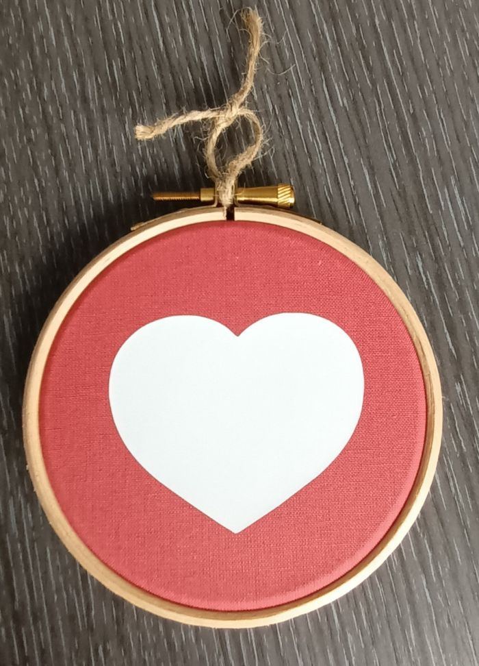Joli tambourin en bois avec cœur blanc sur fond rouge. Parfait pour décorer la chambre de bébé. 11cm