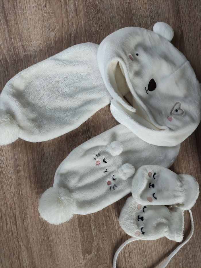 Bonnet, moufles et echarpes écrus marque tape à l'oeil Très bon état taille 12-18 mois Bonnet jamais été porté